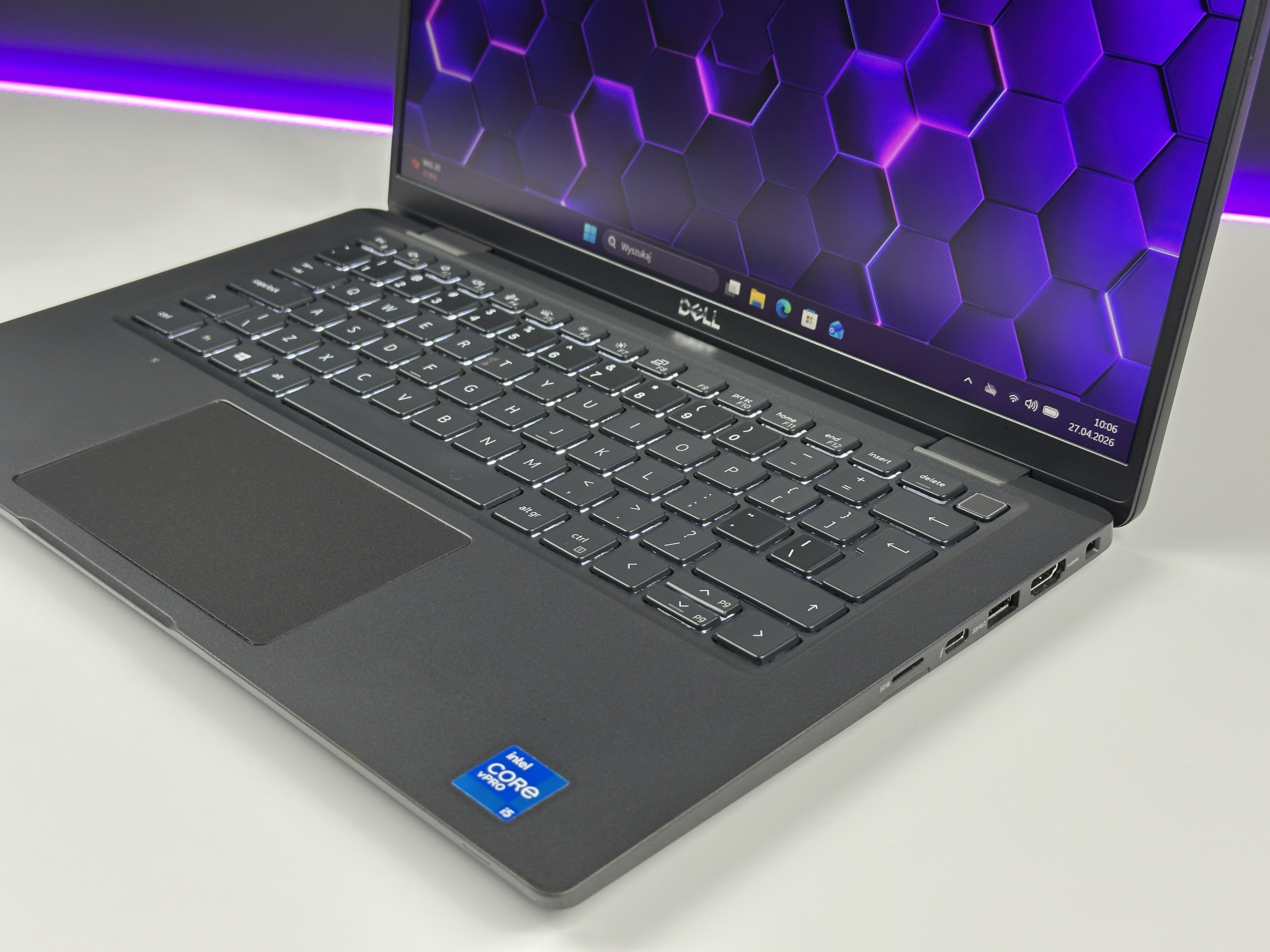 - Nowoczesna łączność i bezpieczeństwo: Laptop wyposażono w porty Thunderbolt™ 4, USB-C, USB 3.2, HDMI oraz gniazdo audio. Dodatkowo dostępne są funkcje zabezpieczeń takie jak TPM 2.0, czytnik linii papilarnych, kamera z zasłoną prywatności. W połączeniu z obsługą Dell SafeBIOS i szyfrowaniem dysków, dane użytkownika są w pełni chronione.