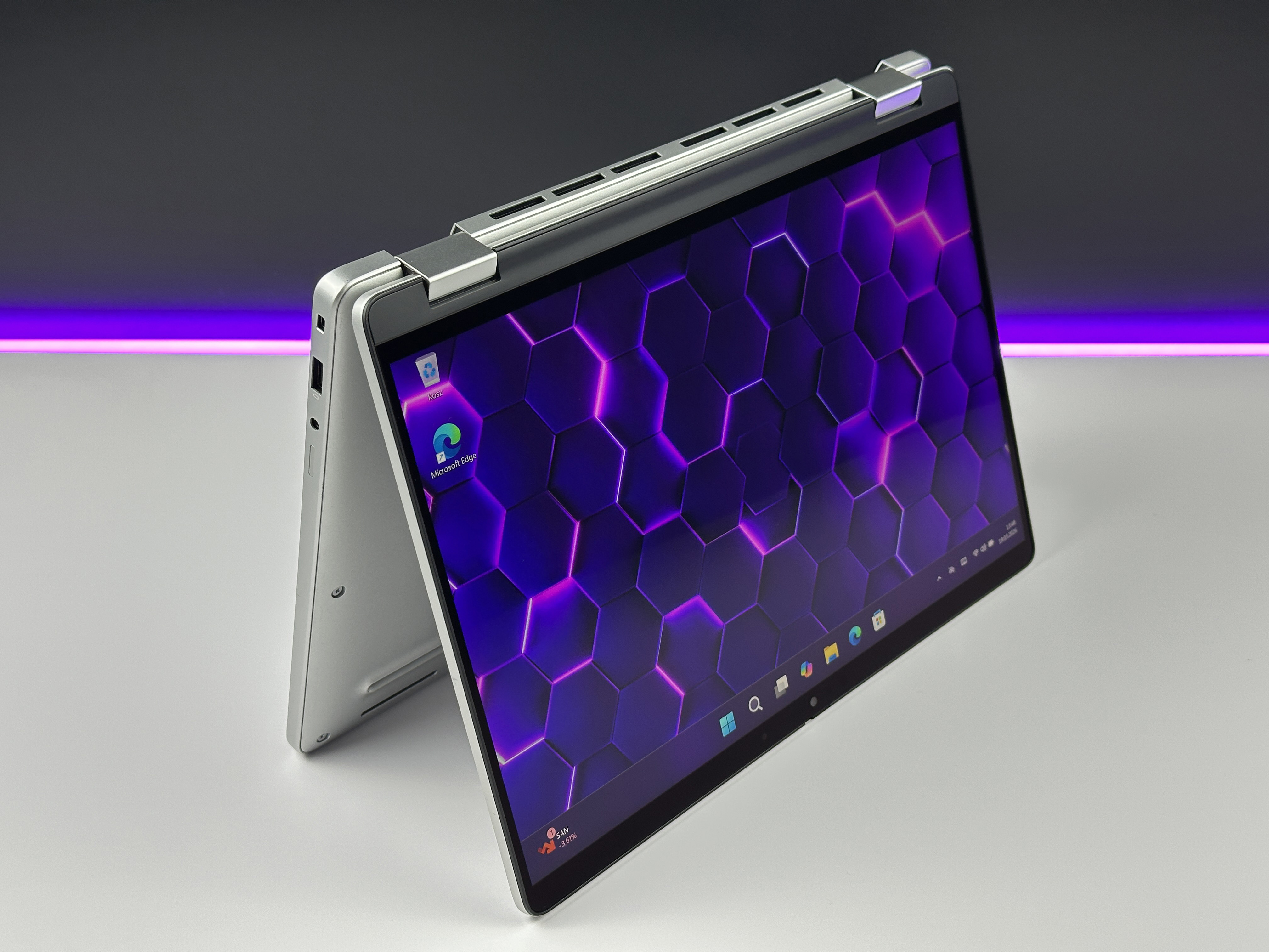 - Konstrukcja 2w1 – elastyczność użytkowania: Możliwość pracy w różnych trybach pozwala dopasować urządzenie do aktualnych potrzeb. Laptop sprawdzi się zarówno przy klasycznej pracy, jak i podczas prezentacji czy notowania.