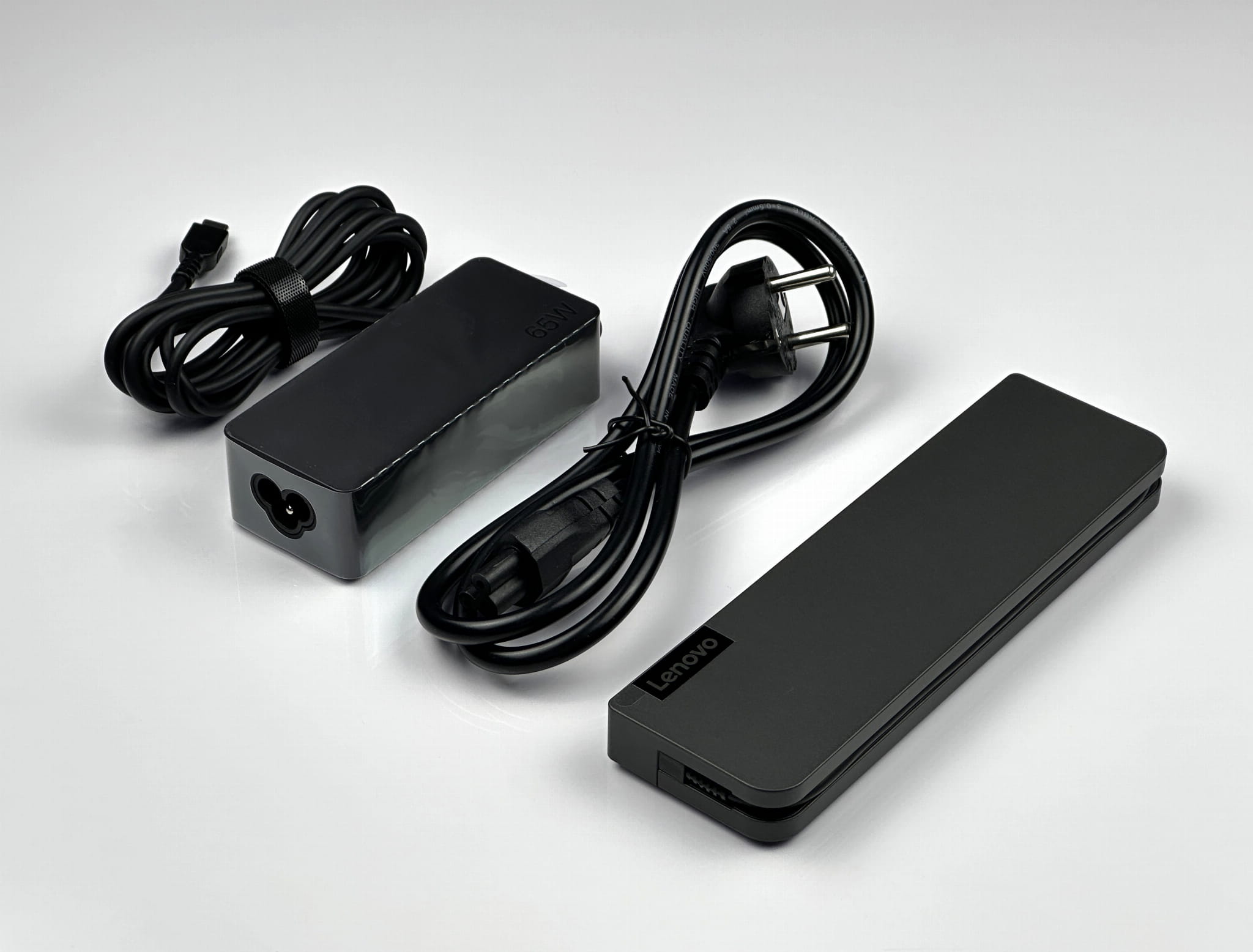 - Ładowanie i zasilanie laptopa: W zestawie znajduje się oryginalny zasilacz 65W i kabel zasilający, dzięki czemu stacja nie tylko rozszerza możliwości laptopa, ale również go zasila, eliminując konieczność stosowania dodatkowych ładowarek.