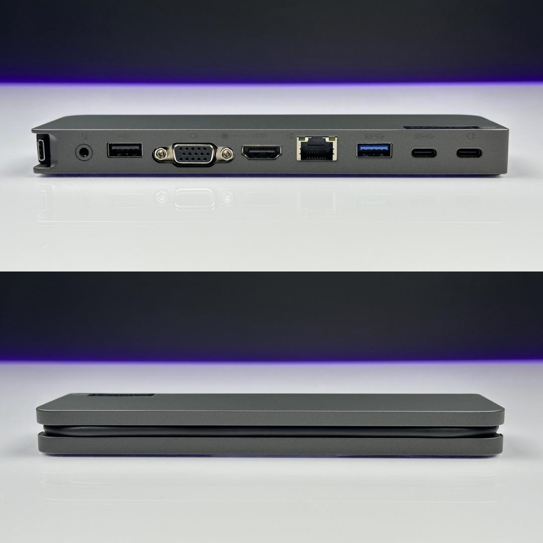 - Rozszerzona łączność: Wyposażona w porty USB-C, USB-A, HDMI, DisplayPort, VGA, Ethernet RJ-45 oraz gniazdo audio, pozwala na szybkie podłączenie monitorów, dysków zewnętrznych, drukarek czy zestawów słuchawkowych.